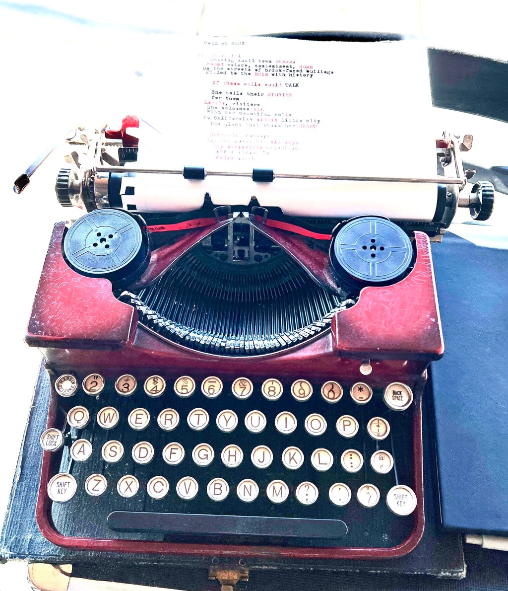 I set her up on top of a borrowed black metal suitcase, stacked on a bar stool . . . out on the sidewalk. In front of shops & vendors (& God and everybody). Me & my ruby red typewriter . . . and we waited.